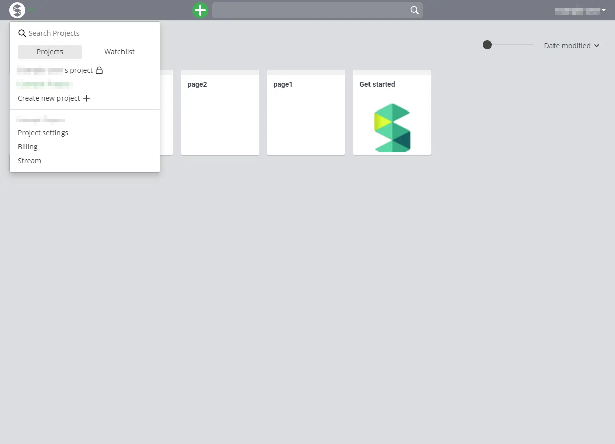 1. Press the “S” button at the top left of the screen, and then select “Create new project”. The “Create new project” button may appear on the screen immediately after you create an account.
