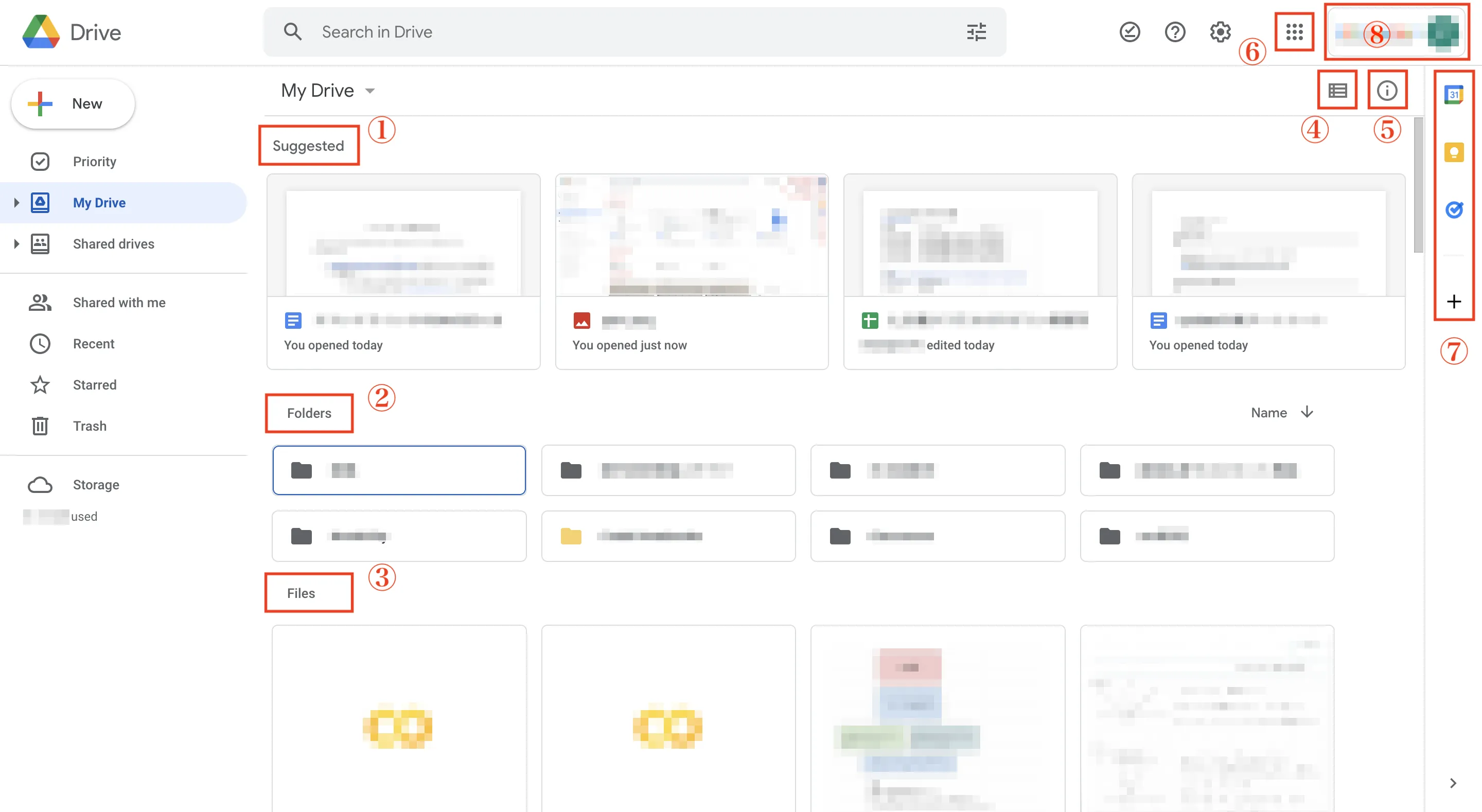 • (5) Detailed view: When you click here without selecting any files, you can see the history of editing and moving files in My Drive. If you click on a file while it is selected, its properties and history will be displayed.