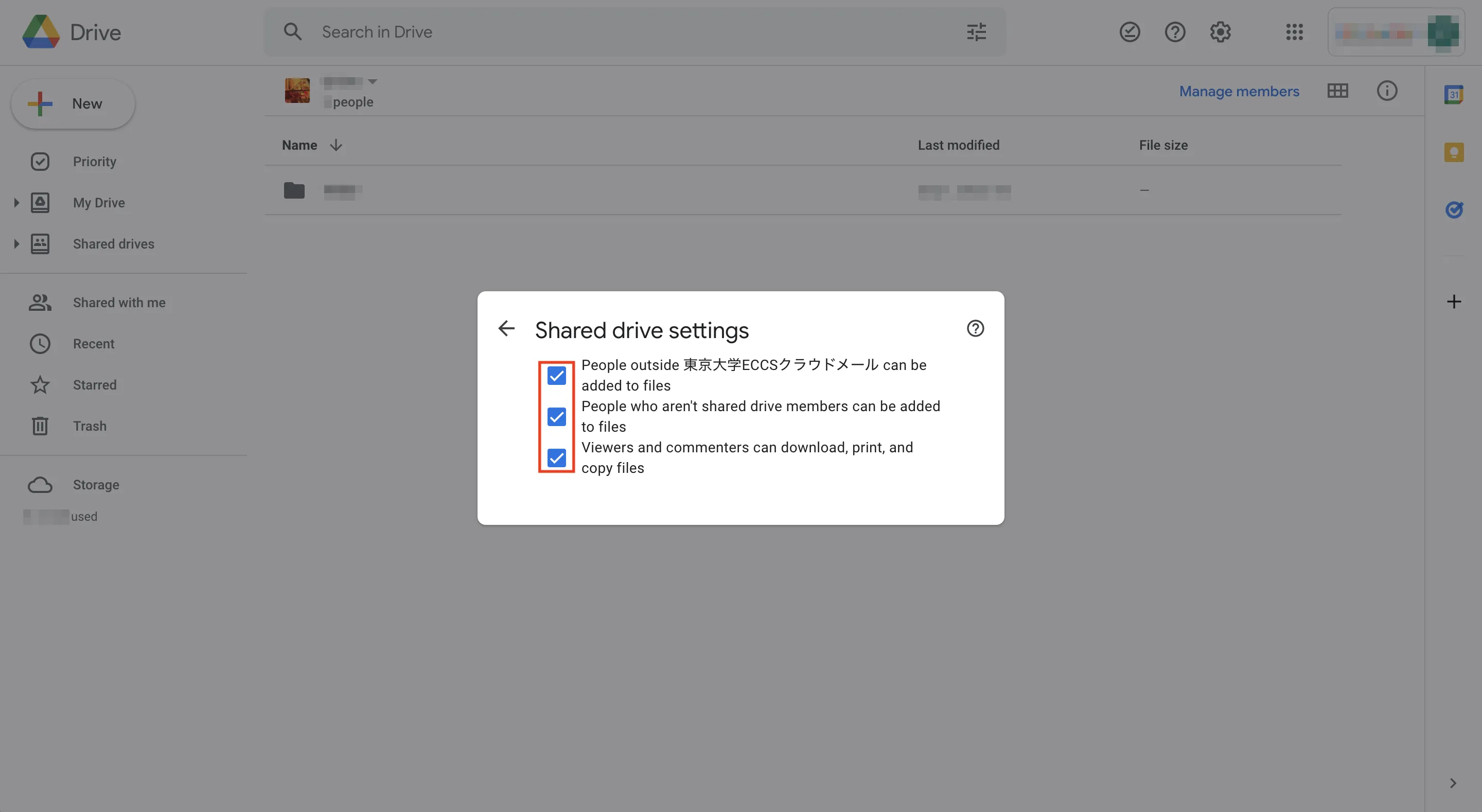 With a shared drive, you can manage files in the drive within your organization. The administrator can grant 5 levels of permissions to members, and can set permissions based on the user’s affiliation and job description. If you log in with your ECCS Cloud Email Account, you can use the university shared drive. However, if you log in with your personal account, you are restricted from accessing it.