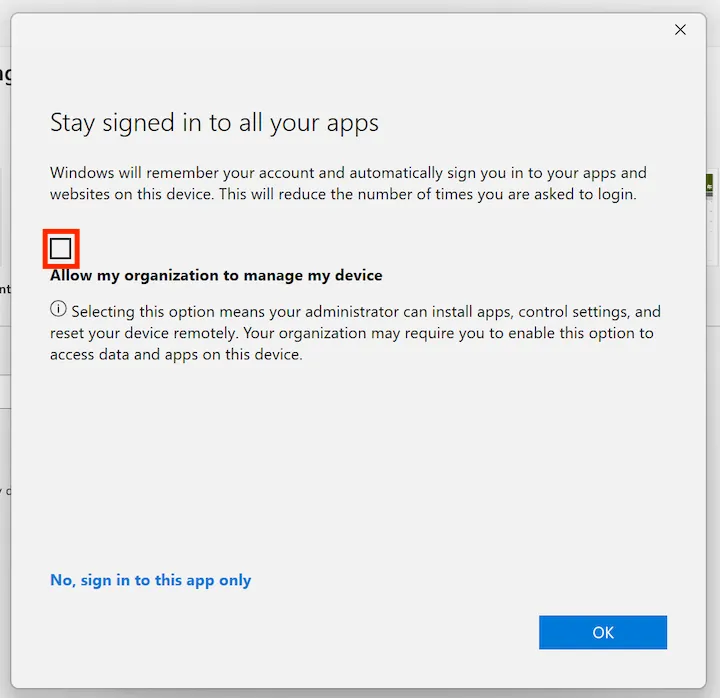 Uncheck the box that says “Allow my organization to manage my device.” Next, if you want to automatically sign in to Microsoft systems other than Office apps (such as OneDrive) with your UTokyo Account, select “OK.” If you only want to sign in to Office apps with your UTokyo Account, select “No, sign in to this app only.”