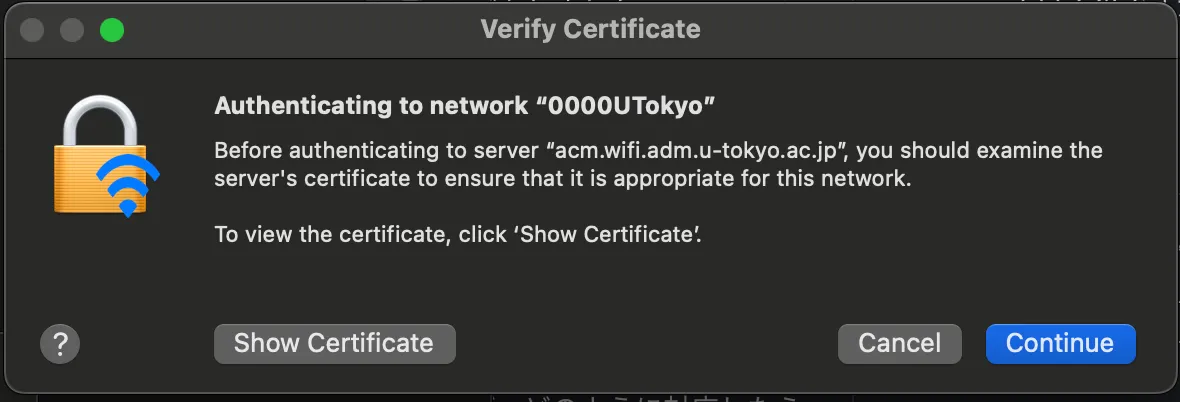 UTokyo Wi-Fi is a Wi-Fi service available to members of the University of Tokyo for educational and research purposes. Please refer to UTokyo Wi-Fi page first, which summarizes the general instructions for using the UTokyo Wi-Fi. If you still need the detailed instructions for terminal with macOS 13 Ventura, please refer to this page.