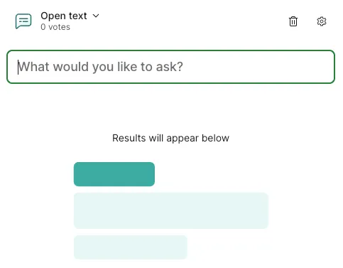 - Word cloudー参加者の回答が「cloud」として可視化される質問を設定する(参加者はOpen textと同様に短文形式で答える)