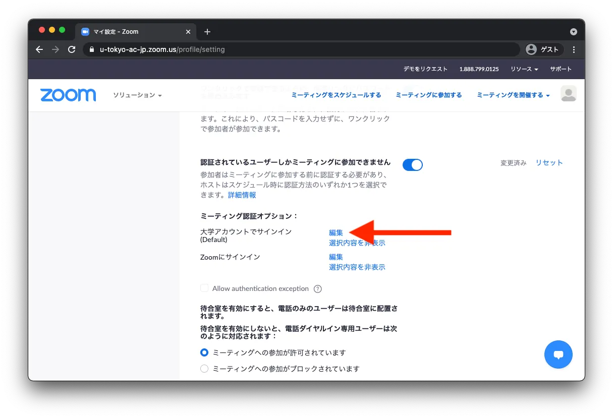 2. 「ミーティング認証オプション:大学アカウントでサインイン (Default) 」の編集ボタンをクリックします.
