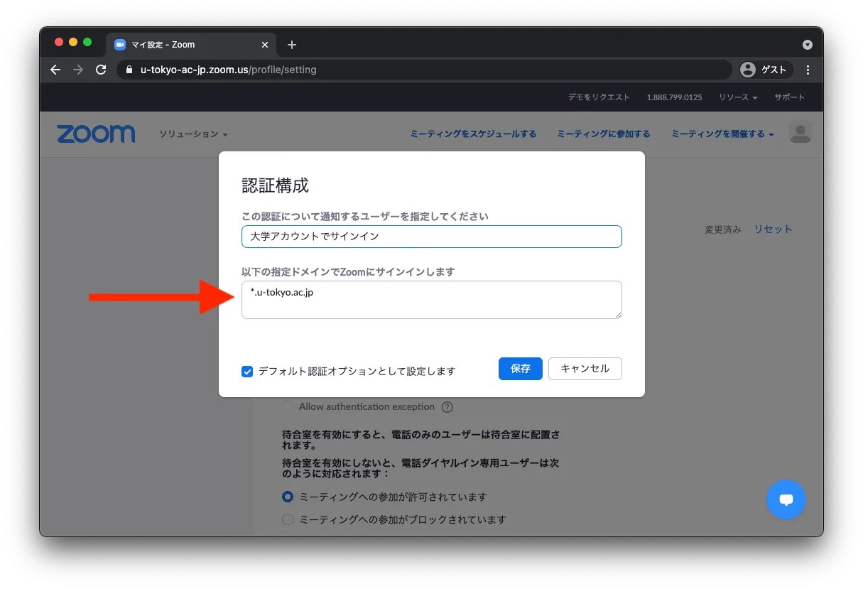 3. 「以下の指定ドメインでZoomにサインインします」が*.u-tokyo.ac.jpとなっていることを確認してください.なっていなければ*.u-tokyo.ac.jpを入力し保存してください.