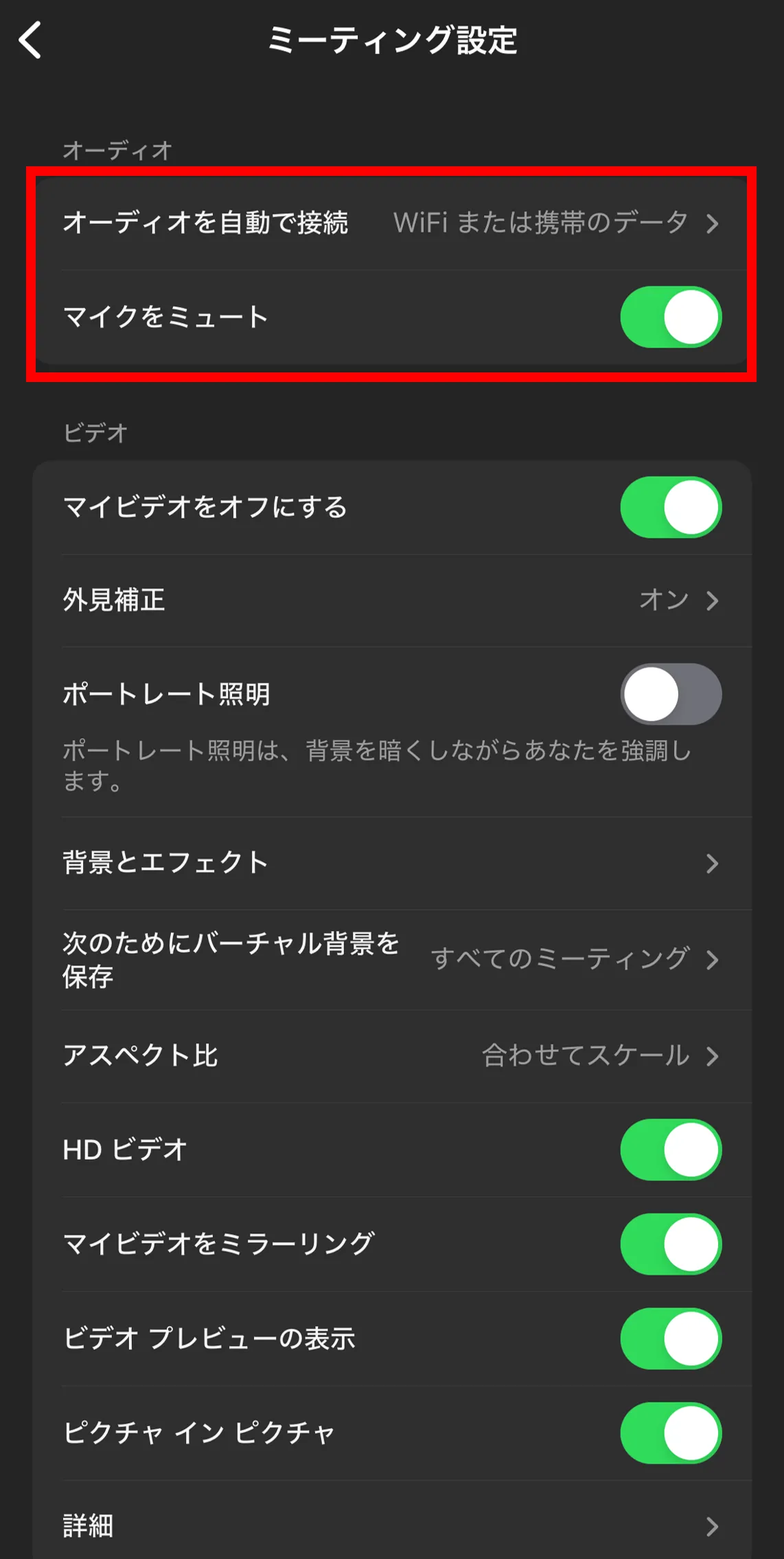 - オーディオを自動で接続:この機能をオンにすることで,ミーティング参加時に毎回オーディオに接続するかどうか確認されることがなくなります.「WiFi または携帯のデータ」を選択すれば問題ありません.